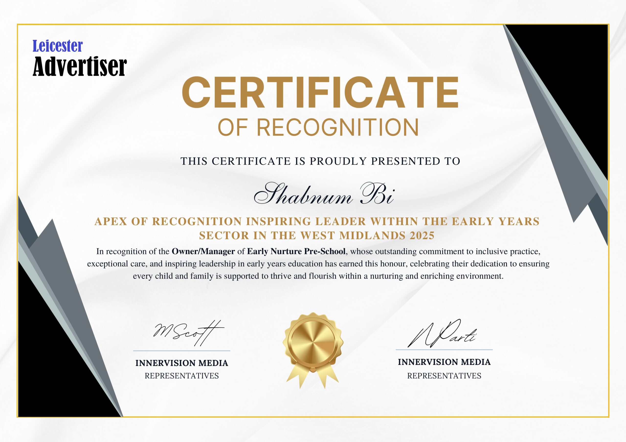 Winning the Apex of Recognition award is a proud moment not only for Shabnum Bi but also for the entire Early Nurture Pre-School community. It affirms the setting’s belief that high-quality early years education should combine ambition with care, structure with play, and planning with flexibility, always keeping the child’s best interests at the centre.